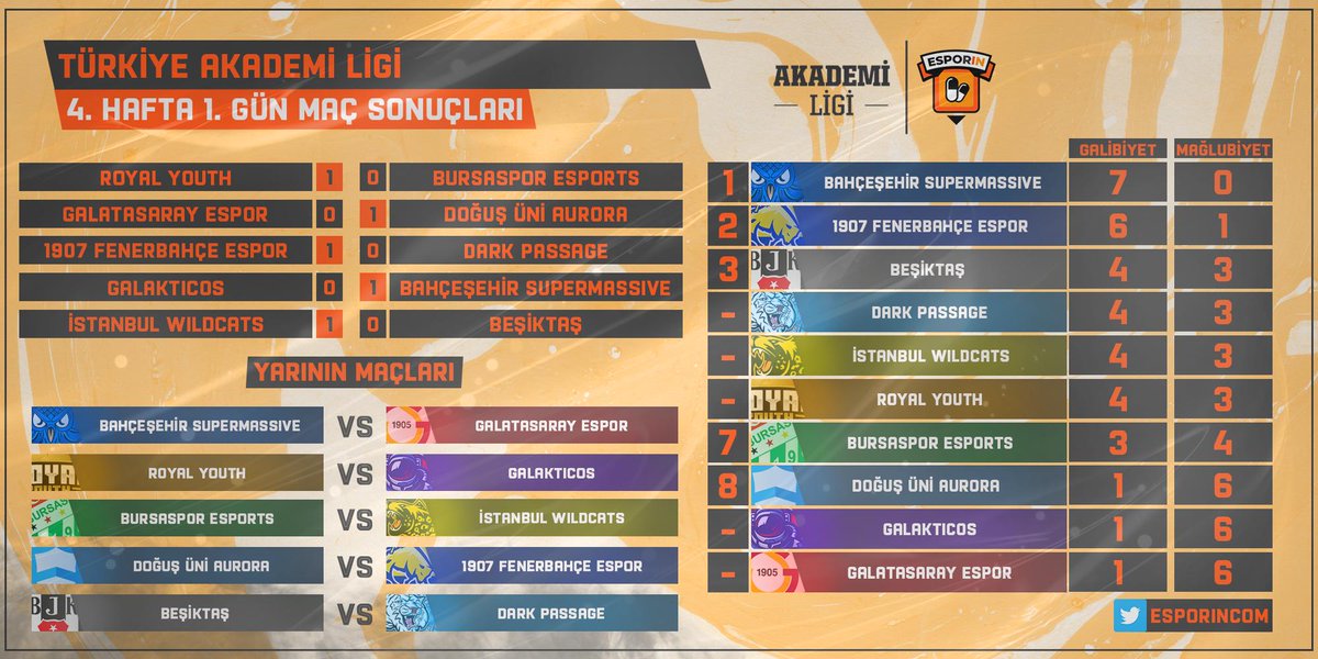 Esporin على تويتر Turkiye Akademi Ligi Nde 4 Haftanin Ilk Gunu Tamamlandi Bahcesehir Supermassive In Namaglup Liderligi Devam Ederken Galatasaray Espor Teknik Problem Sebebiyle Bugunku Maca Cikamadi Ve Hukmen Kazanan Dogus Uni Aurora Bu