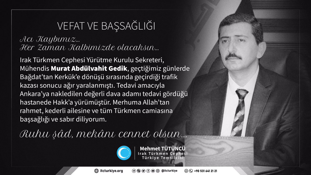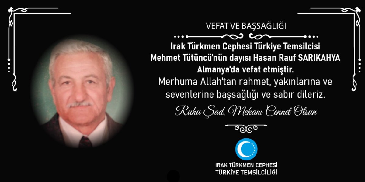 Irak Turkmen Cephesi Turkiye Temsilciligi On Twitter Vefat Ve Bassagligi Irak Turkmen Cephesi Turkiye Temsilcisi Mehmet Tutuncu Nun Dayisi Hasan Rauf Sarikahya Almanya Da Vefat Etmistir Merhuma Allah Tan Rahmet Yakinlarina Ve Sevenlerine Bassagligi Ve