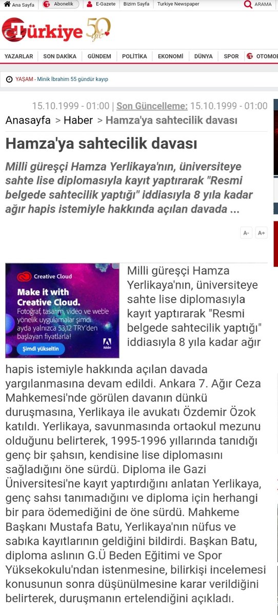 Batuhan Colak On Twitter 15 10 1999 Tarihli Turkiye Gazetesinden Bir Haber Hamza Yerlikaya Sahte Diploma Ve Sahtecilik Sucundan 8 Yilla Yargilaniyor Habere Gore Yerlikaya Ortaokul Mezunu Tanimadigi Bir Sahis Ona Lise Diplomasi Sagliyor