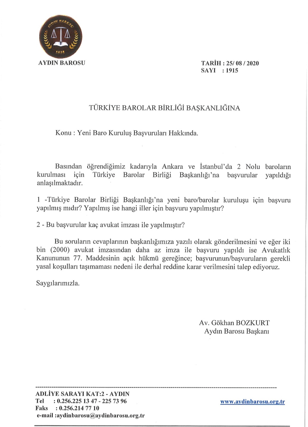 Av Gokhan Bozkurt V Twitter Bugun Turkiye Barolar Birligi Ne Yazili Olarak Da Sorduk Ve Eger 2000 Den Az Imzayla Yapildiysa Yeni Baro Basvurularinin Avukatlik Yasasi Nin 77 Maddesinin Acik Hukmu Geregince Derhal Reddedilmesini Talep Ettik