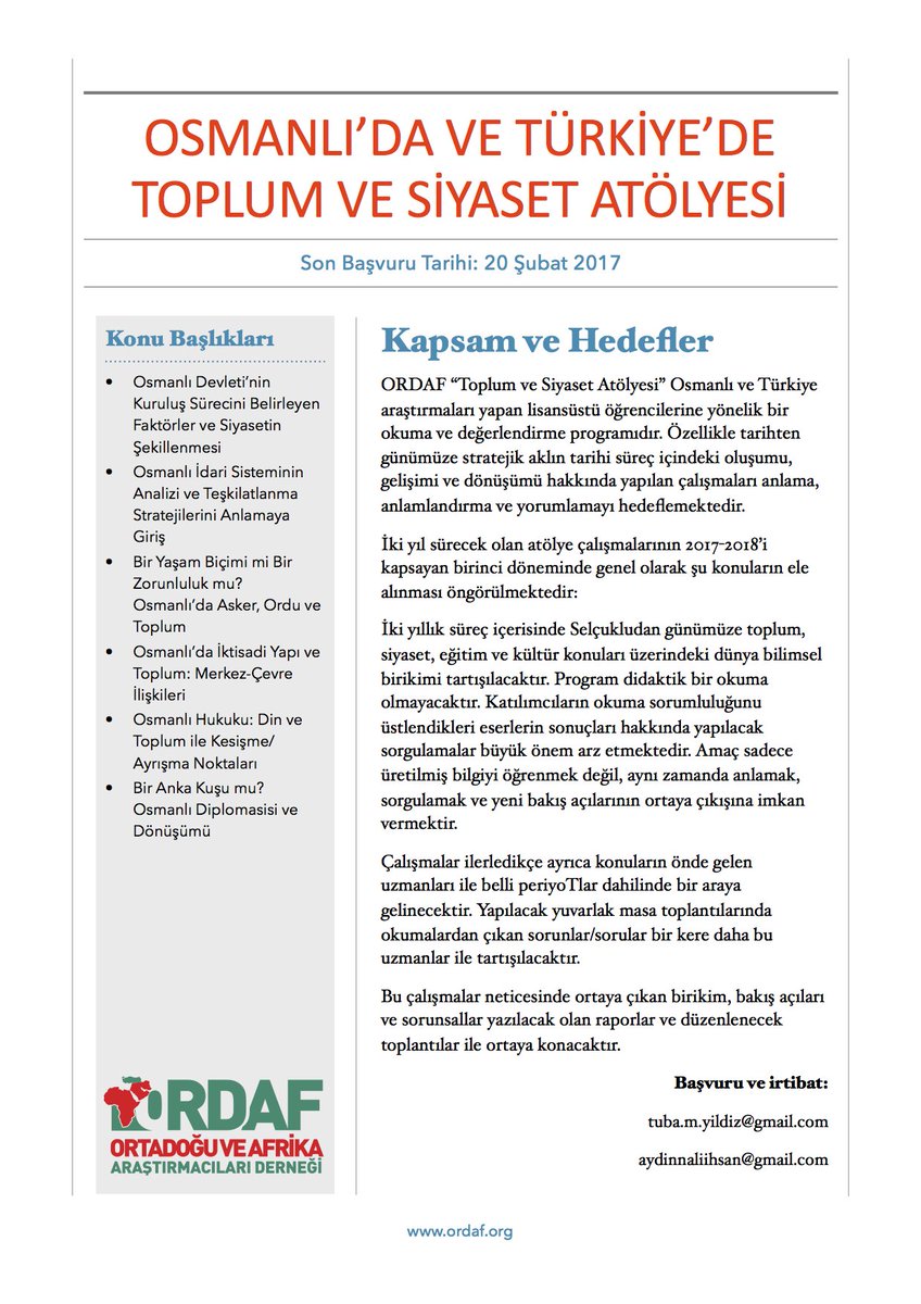 Ordaf On Twitter Atolye Duyurusu Ordaf Osmanli Da Ve Turkiye De Toplum Ve Siyaset Atolyesi Son Basvuru Tarihi 20 Subat 2017