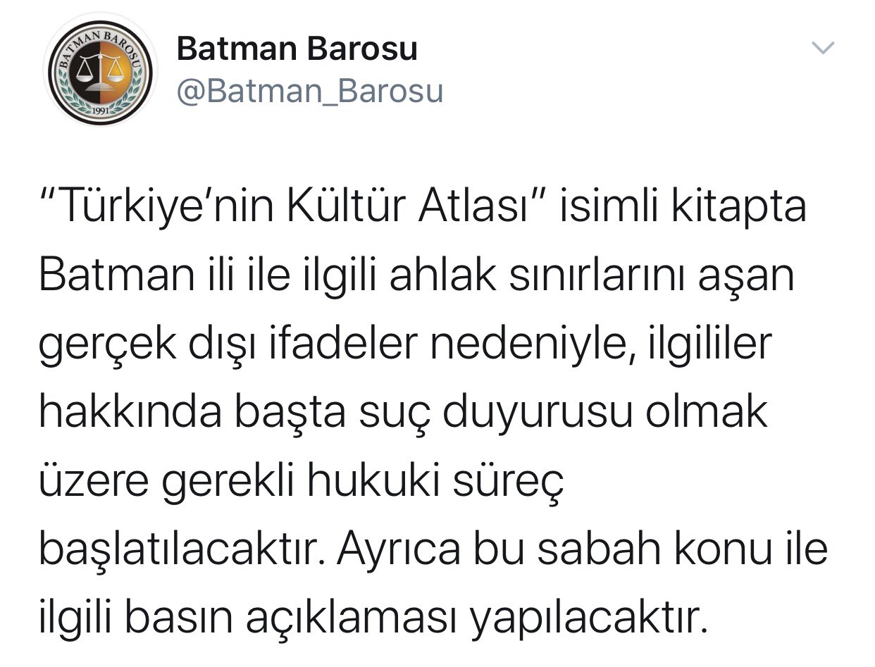 Ahmet Gunestekin On Twitter Batman Barosu Nun Suc Duyurusunu Destekliyorum Turkiye Nin Kultur Atlasi Kitabi Batman Ve Batmanlilarla Ilgili Iftira Ustunkoru Irkci Ve Cinsiyetci Karalamalarla Dolu Kadina Siddetin Ve Ensestin Merkezi Gibi