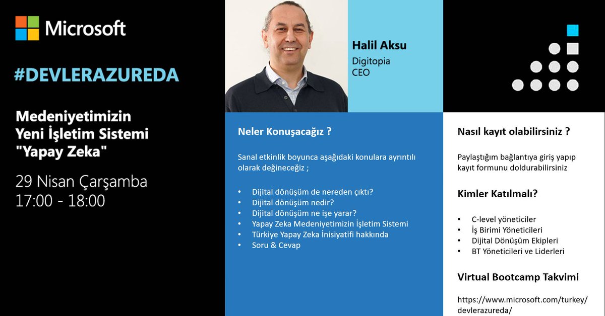 Turkiye Yapay Zeka Inisiyatifi On Twitter Turkiye Yapay Zeka Inisiyatifi Kurucusu Halil Aksu Microsoft Un Devler Azure Da Programi Kapsaminda Bugun Saat 17 00 Da Konusma Yapacak Kayit Olmak Icin Https T Co Iuzfwcm8v4 Trai