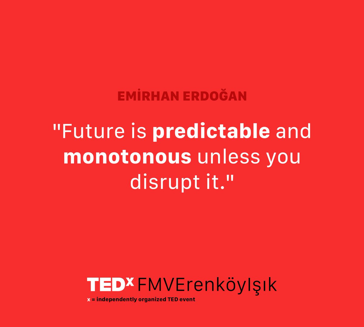Emirhan Erdogan On Twitter Future Is Predictable And Monotonous Unless You Disrupt It 06 October At Tedxfmverenkoyisik Tedx Thinkingoutsideofthebox Https T Co Wdrcypw6mr