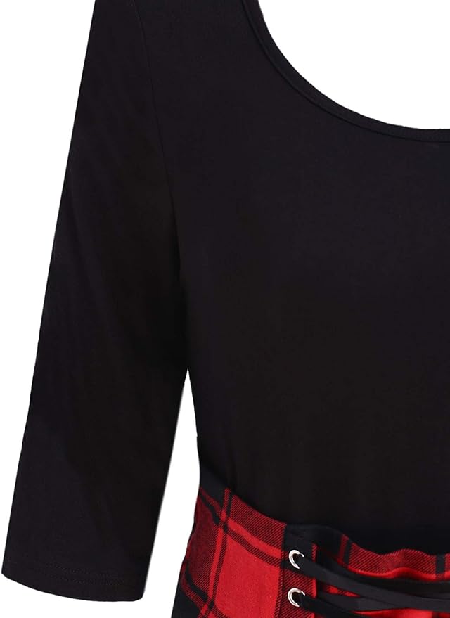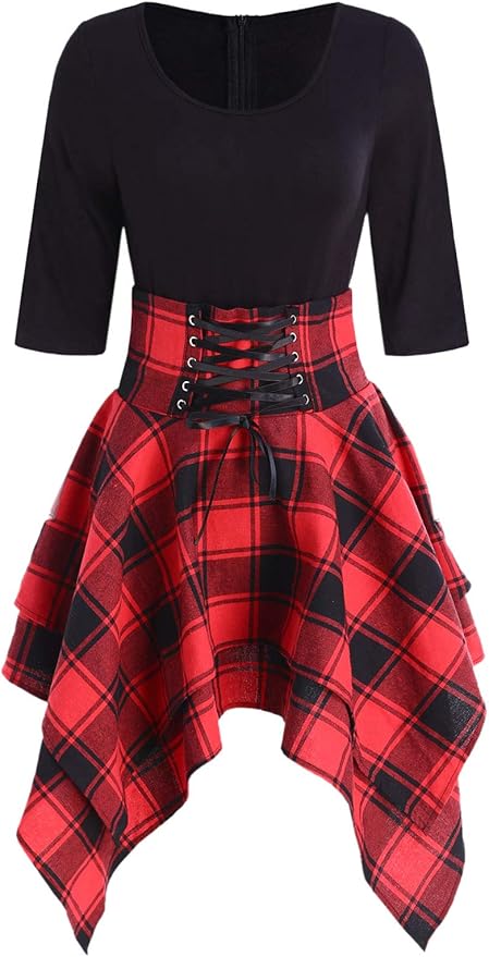 Kenancy Women S Lace Up Plaid Asymmetrical Dress 1 2 Sleeve Round Collar Tartan Dresses Red 2xl Amazon Co Uk Clothing